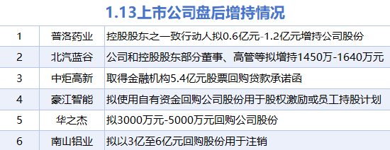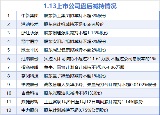 据统计,1月13日,盘后普洛药业、北汽蓝谷、中炬高新、豪江智能、华之杰、南山铝业披露增持情况。包括中新集团、港迪技术、浙江永强、翔宇医疗、漱玉平民、红墙股份、招商轮船、掌阅科技、柏诚股份、鼎捷数智、吉鑫科技、中力股份在内的12家A股上市公司披露减持情况。