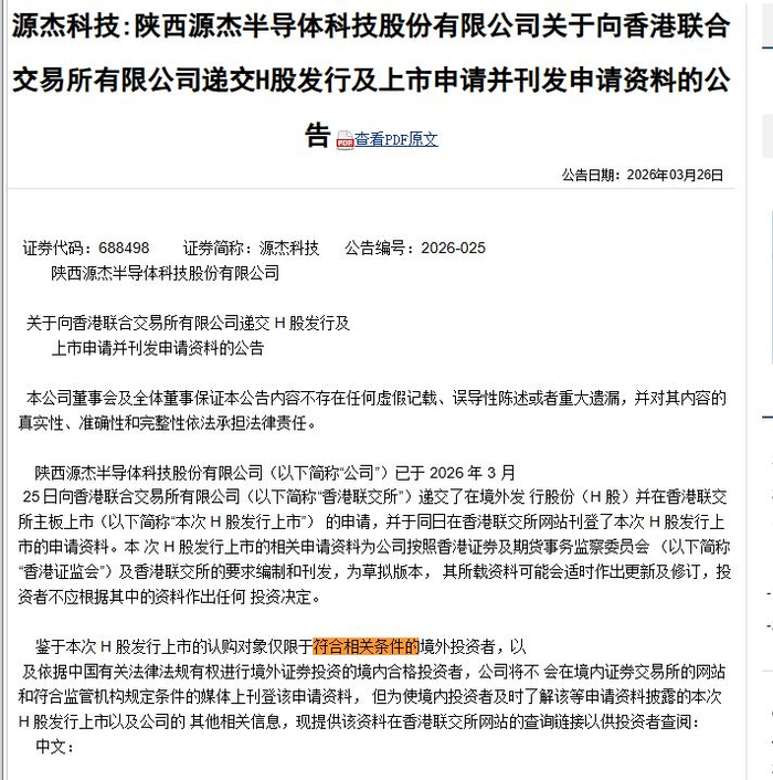 源杰科技于2026年3月25日在香港联交所网站刊登了本次H股发行上市的申请资料。根据公告,此次H股发行上市的认购对象仅限于符合相关条件的境外投资者,及有权进行境外证券投资的境内合格投资者。