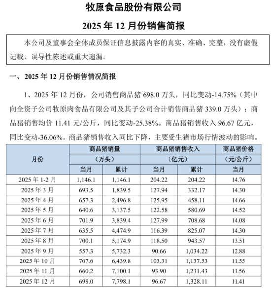 对于猪价何时能够迎来拐点,东方证券研报指出,新生仔猪量在2025年10月后已逐步下行,按照6个月的生长周期推算,2026年4至5月猪价拐点将现。中邮证券也分析称,2025年5月后行业产能开始去化,对应着2026年下半年供应将减少,猪价或将进入新一轮上行周期。
