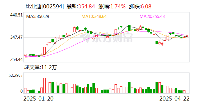截至4月22日收盘,比亚迪A股报收于354.84元/股,总市值1.07万亿元。