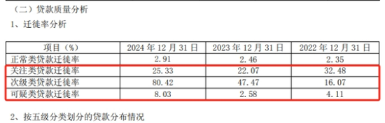 证券之星注意到,截至2024年末,紫金银行三大贷款迁徙率指标集体上升,其中关注类贷款迁徙率从去年的22.07%上升至25.33%;次级类贷款迁徙率则从去年的47.47%骤升至80.42%;可疑类贷款迁徙率从2.58%上升到了8.03%。