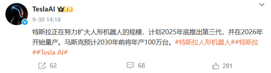 9月30日,“TeslaAI”再发文,特斯拉正在努力扩大人形机器人的规模,计划2025年底推出第三代,并在2026年开始量产。马斯克预计2030年前将年产100万台。