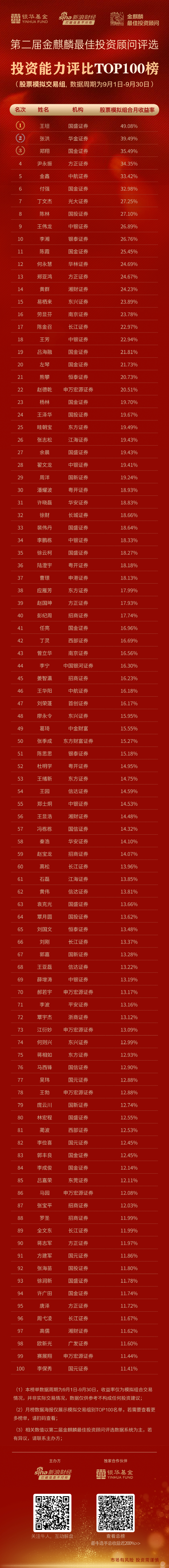 目前金麒麟最佳投资顾问评选火热进行中!股票模拟交易、场内ETF模拟交易、公募基金模拟配置、社交服务评比……万名投顾大PK,9月月榜数据(周期为8月1日-8月31日)显示,股票模拟组合评比中,国盛证券投顾王坦(来自沈阳市府大路证券营业部)以收益率49.08%居月榜榜首;