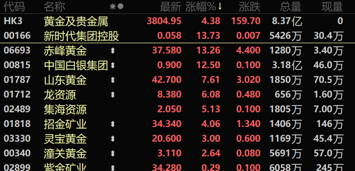 受金价上涨影响,国庆中秋长假期间港股有色金属个股跟涨,赤峰黄金港股10月8日大涨13.26%,股价创上市以来新高,假期期间累计上涨23.54%;中国白银集团10月8日上涨12.5%,累计上涨69.81%;山东黄金累计上涨15.59%,紫金黄金国际累计上涨21.48%。
