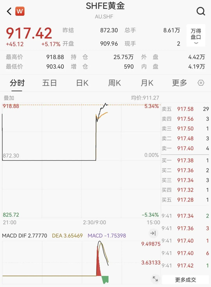 消息面上,沪金期货主力合约日内涨幅扩大超5%,现报917.42元/克,续创历史新高。此外,国庆中秋长假期间,COMEX黄金期货累计上涨4.45%;COMEX白银期货累计上涨3.42%。