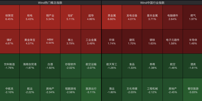 板块上来看,贵金属板块强势走高,核聚变、基本金属、燃气等板块表现活跃;餐饮旅游、房地产、文化传媒等板块跌幅居前。