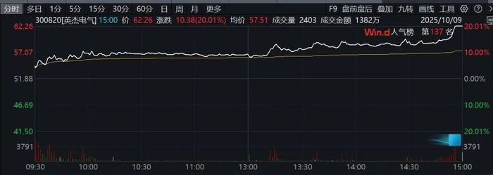 市场焦点方面,芯片股全线走强,板块指数放量高开高走创历史新高。板块内个股掀涨停潮,国庆前刚上市的云汉芯城(301563)盘中因达到涨幅限制二度临停,收盘仍大涨超40%,英杰电气、灿芯股份20%涨停,燕东微、芯原股份、深科技、通富微电等逾30股涨停或涨超10%。