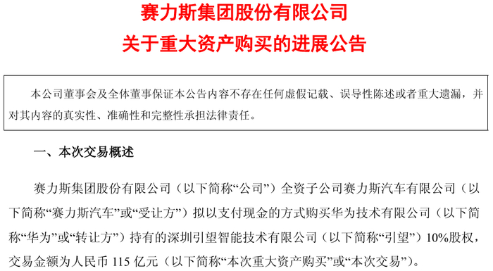 2024年8月25日,赛力斯发布公告称,2024年8月23日,公司第五届董事会第十五次会议同意赛力斯汽车以支付现金的方式购买华为技术有限公司持有的引望10%股权,交易金额为115亿元。