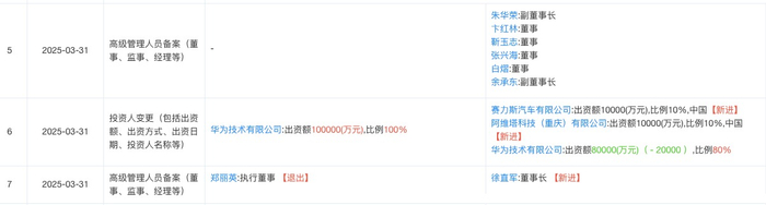 引望高级管理人员备案显示,华为轮值董事长徐直军任董事长,中国长安党委书记、董事长朱华荣任副董事长,华为常务董事、终端BG董事长余承东任副董事长,赛力斯集团董事长(创始人)张兴海任董事。