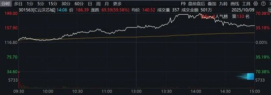 市场焦点方面,芯片股全线走强,板块指数放量高开高走创历史新高。板块内个股掀涨停潮,国庆前刚上市的云汉芯城(301563)盘中因达到涨幅限制二度临停,收盘仍大涨超40%,英杰电气、灿芯股份20%涨停,燕东微、芯原股份、深科技、通富微电等逾30股涨停或涨超10%。