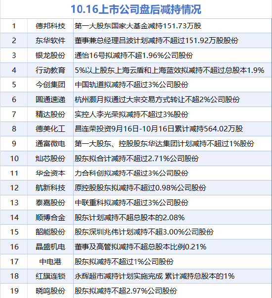 10月16日增减持汇总:暂无增持 德邦科技等19股减持(表)
