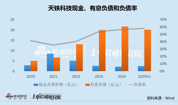 2021年定增融资完成后,天铁科技负债率有所下降,但此后又重回升势,到2025年6月末已达到59%的历史新高。