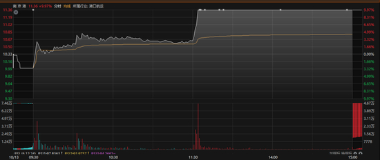 10月13日午后,南京港股价直线拉升,4分钟内封住涨停;连云港也大幅拉升,涨幅一度接近8%;部分航运股也有拉升动作,国航远洋、宁波海运一度涨超6%。