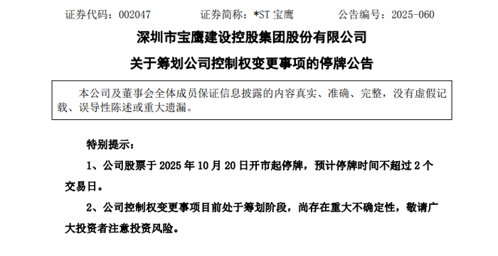 *ST宝鹰(002047)10月20日午间公告,公司收到公司控股股东珠海大横琴集团有限公司(简称“大横琴集团”)的通知,大横琴集团正在筹划公司控制权变更事宜,该事项可能导致公司控股股东、实际控制人发生变更。