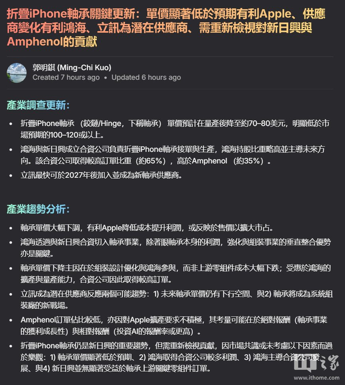 郭明錤:苹果 iPhone Fold 铰链成本低于预期,立讯精密有望成供应商