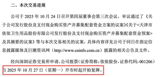 10月26日晚间,依依股份公告,正筹划以发行股份及支付现金相结合的方式,收购杭州高爷家有好多猫宠物食品有限责任公司(下称“高爷家”)全部股权,并同步募集配套资金。公司股票自2025年10月27日(星期一)开市复牌。