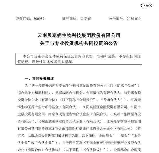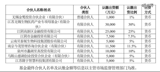 投资界-解码LP获悉,近日,贝泰妮发布公告,公司拟作为有限合伙人,与无锡金鹫投资合伙企业(有限合伙)、江苏无锡生物医药产业专项母基金(有限合伙)、江阴高新区金融投资有限公司、江阴市金融投资有限公司、南京今茂管理咨询合伙企业(有限合伙)、泉州市蠡湖至真投资有限公司、马鞍山慈湖创业投资合伙企业(有限合伙)、江苏隆宇智慧科技集团有限公司共同出资设立无锡金雨茂物医疗健康产业投资合伙企业(有限合伙)(暂定名)。