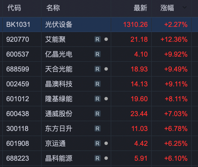 BC电池、HJT电池、TOPCon电池、钙钛矿电池等细分板块纷纷走强,耀皮玻璃(600819)、晶澳科技(002459)、双良节能(600481)、东方日升(300118)等涨幅居前。