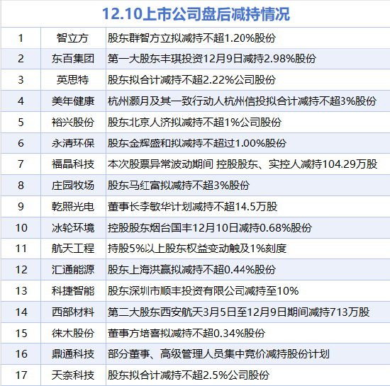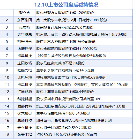 据统计,12月10日,盘后星宇股份披露增持情况。包括智立方、东百集团、英思特、美年健康、裕兴股份、永清环保、福晶科技、庄园牧场、乾照光电、冰轮环境、汇通能源、科捷智能、西部材料、徕木股份、鼎通科技、天奈科技、航天工程在内的17家A股上市公司披露减持情况。