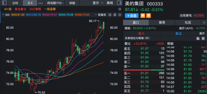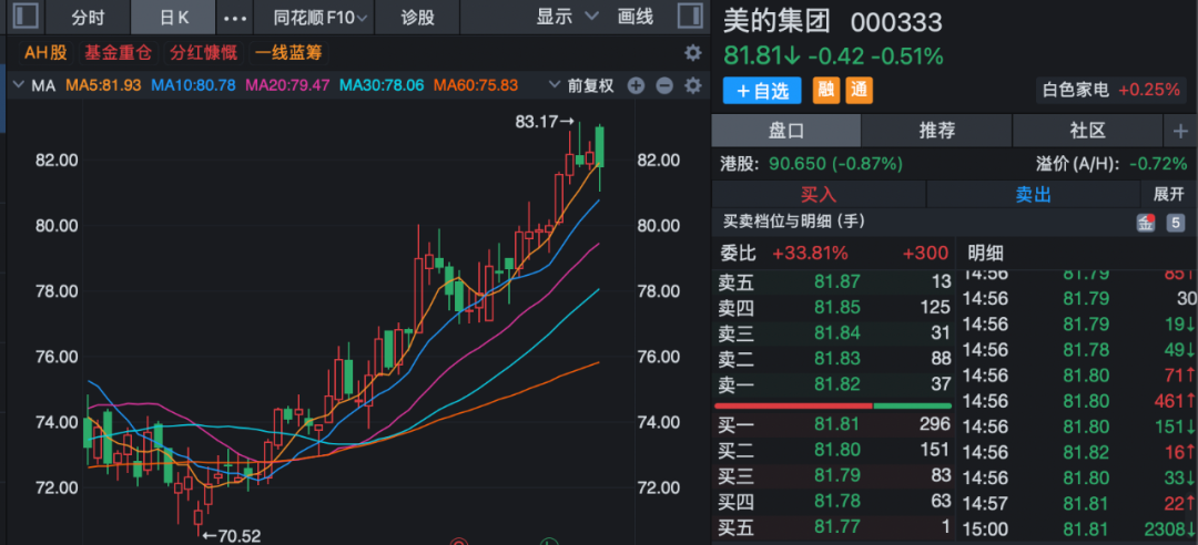 近期,美的集团股价持续走高。信息显示,今年10月以来,美的集团股价上涨约13%。截至12月8日,美的集团收盘价为81.81元/股。