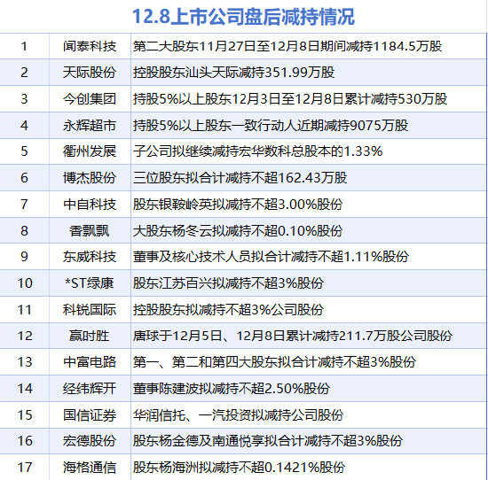 据统计,12月8日,盘后美的集团、京基智农、海伦哲、长江电力、苏州银行披露增持情况。包括闻泰科技、天际股份、今创集团、永辉超市、博杰股份、衢州发展、中自科技、香飘飘、东威科技、*ST绿康、科锐国际、赢时胜、中富电路、经纬辉开、国信证券、宏德股份、海格通信在内的17家A股上市公司披露减持情况。