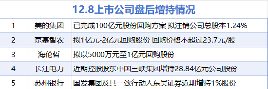12月8日增减持汇总:工业富联等5股增持 睿能科技等17股减持(表)