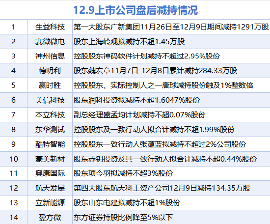 据统计,12月9日,盘后金融街、宋城演艺、英派斯、惠泰医疗、金固股份披露增持情况。包括生益科技、赛微微电、神州信息、德明利、美信科技、赢时胜、本立科技、东华测试、酷特智能、豪美新材、奥康国际、航天发展、立新能源、盈方微在内的14家A股上市公司披露减持情况。