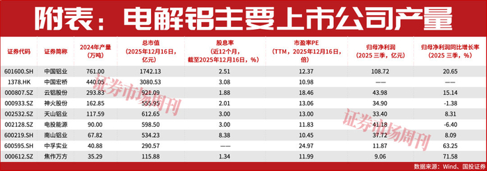 从A股电解铝上市公司来看,目前中国铝业、云铝股份、神火股份、天山铝业等电解铝产量居前。据国投证券,截至2024年,前述企业电解铝产量分别为761万吨、293.83万吨、162.85万吨、117.59万吨(见附表)。