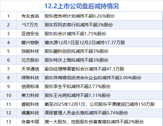 据统计,12月2日,盘后宁德时代、江苏神通、平煤股份、澜起科技、世纪华通披露增持情况。包括有友食品、*ST万方、亚信安全、碧兴物联、北方股份、派能科技、天孚通信、绿联科技、美力科技、信测标准、睿能科技、福赛科技、合富中国在内的13家A股上市公司披露减持情况。