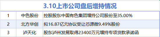 3月10日增减持汇总:中色股份等3股增持 大中矿业等7股减持(表)