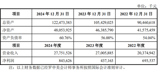 截至2024年12月31日,中创新航总资产12,247,338万元,净资产4,805,393万元;2024年度实现营业收入2,775,153万元,净利润为84,363万元。最近三年的主要财务数据如下: