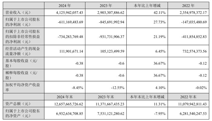 报告期内,京东方华灿光电股份有限公司实现营业收入412,594.21万元,较上年同期增长42.11%;归属于上市公司股东的净利润为-61,116.95万元,较上年同期增加23,452.25万元。资产总额1,265,766.57万元,资产负债率45.23%;归属于上市公司股东的净资产为693,263.47万元,较上年同期下降7.95%。