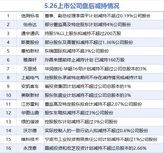 据统计,5月26日,神州数码、新华医疗披露增持情况。包括信测标准、怡合达、通宇通讯、斯菱股份、惠柏新材、雅葆轩、万里扬、安凯客车、美联新材、江苏雷利、绿的谐波、华图山鼎、沃尔德、维科技术、永茂泰在内的15家上市公司披露减持情况。