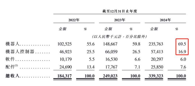 公开资料显示,仙工智能的收入主要来自销售集成了SRC系列机器人控制器的机器人。数据显示,2024年,仙工智能来自机器人、机器人控制器的收入占比分别达到69.5%、16.9%。
