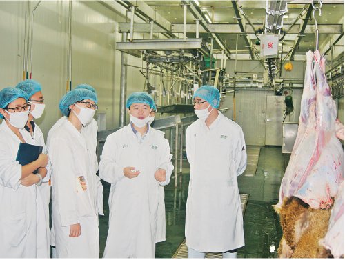 张德权(右二)带领团队党支部成员在企业肉羊生产加工车间开展技术指导。 受访者供图