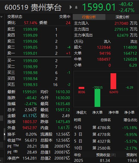 贵州茅台跌破1600元整数关口 为近3个月来首次