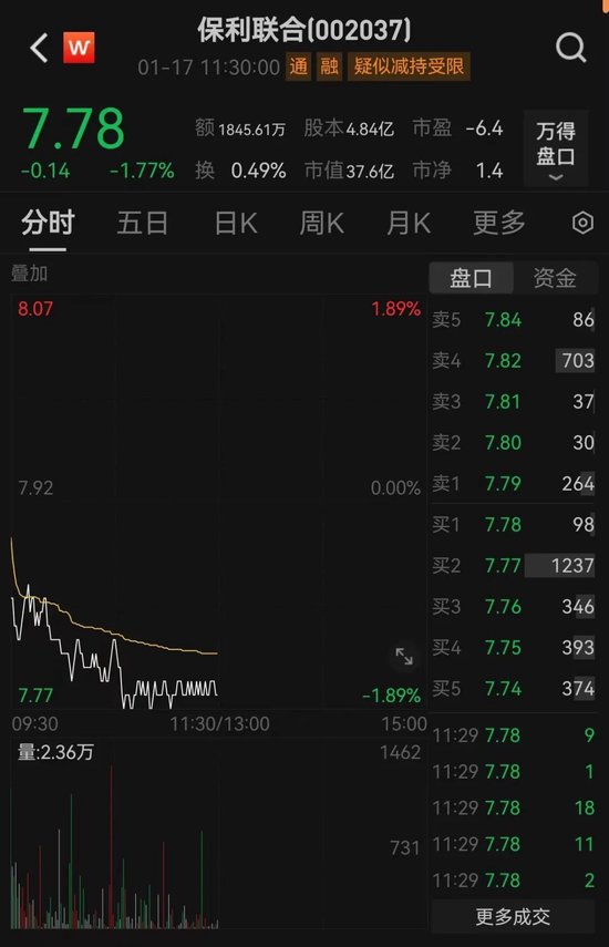 截至今日午间,保利联合股价下跌1.77%,最新市值近38亿元。
