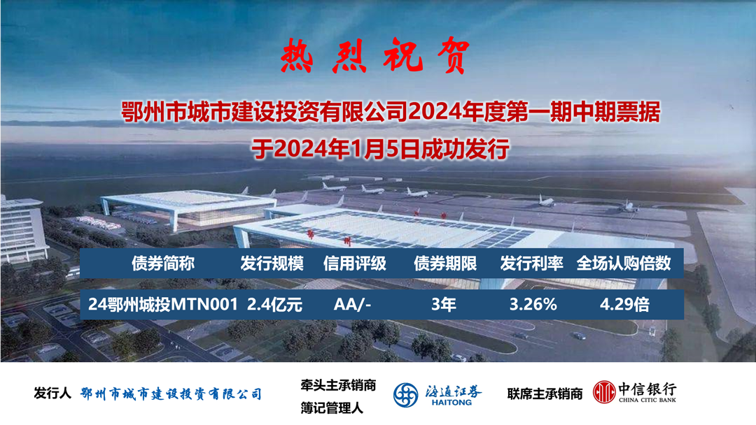 近日,海通证券作为牵头主承销商,助力鄂州市城市建设投资有限公司(以下简称鄂州城投)成功发行2024年度第一期中期票据,发行规模2.4亿元,期限3年,票面利率3.26%。本期债券募集资金主要用于置换债务融资工具,有利于企业优化债务结构,降低融资成本。