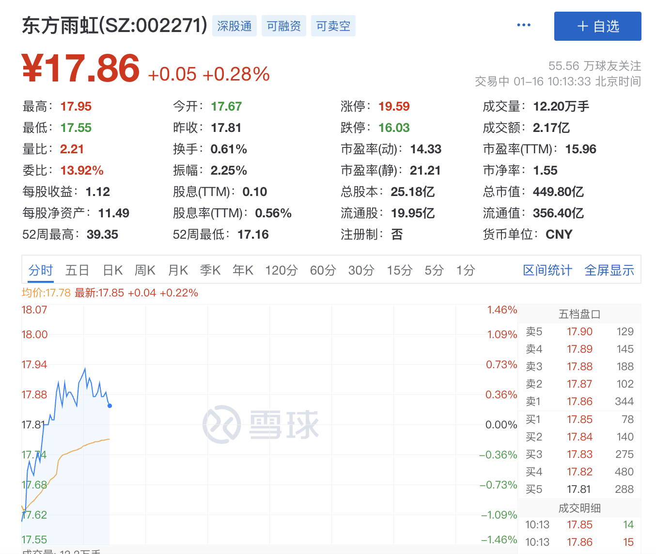 实控人抛出大额减持计划,公司股价第二天却意外翻红。1月16日,东方雨虹(002271.SZ)股价低开高走,截至发稿,报17.88元,涨0.39%。