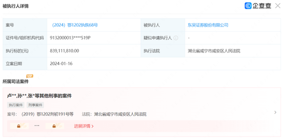 据企查查显示,1月16日,湖北省咸宁市咸安区人民法院(简称:咸安区法院)立案,案号为(2024)鄂1202执恢68号。东吴证券为被执行人,执行标的为839,111,810元。