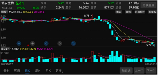 与此同时,去年7月份傲农生物引入漳州国资。目前漳州金投是傲农生物第三大股东,在双方战略合作框架协议中,未来五年饲料类原料合作目标预计每年不低于50亿元。然而随着子公司对簿公堂,漳州国资在公司能发挥何种作用尚未可知。值得一提的是,漳州金投当时的转让价格为8.89元/股,而截至1月18日收盘,傲农生物的股价为5.41元/股,漳州金投近半年的时间便浮亏近4成。