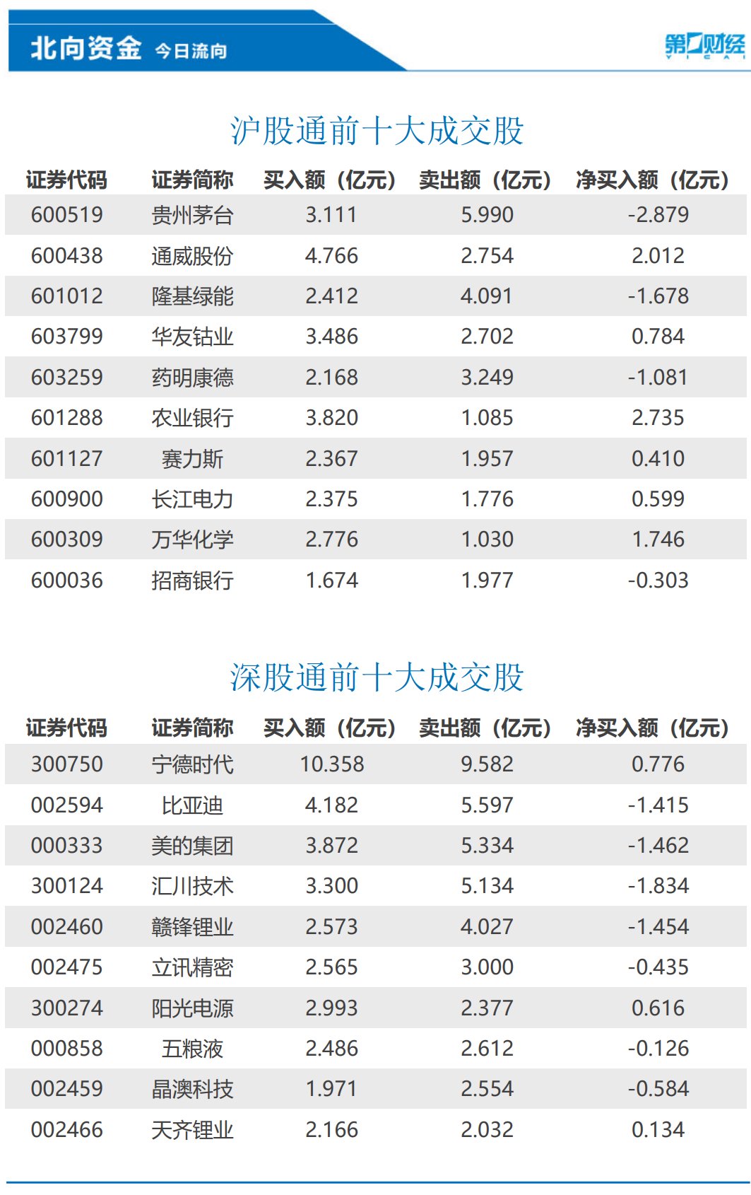前十大成交股中,净买入额居前三的是农业银行、通威股份、万华化学,分别获净买入2.73亿元、2.01亿元、1.75亿元。