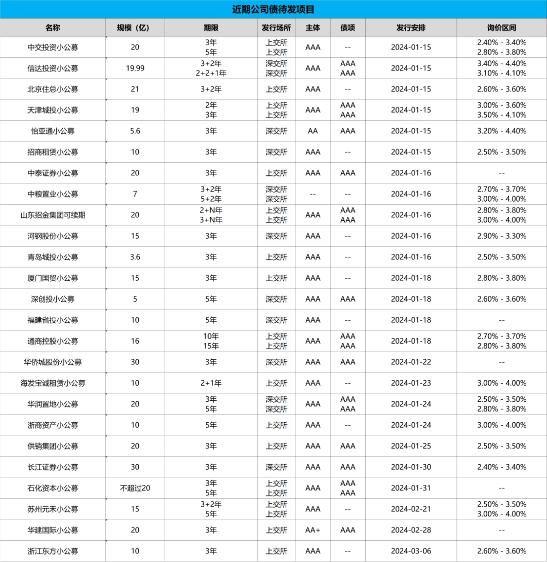 1.【*中交投资有限公司2024年面向专业投资者公开发行公司债券(第一期)】中交投资有限公司,北京市-北京市,20亿,3年(2.40%-3.40%),5年(2.80%-3.80%)中诚信AAA/-,无担保,上交所,01.15簿记,01.17起息,01.17缴款