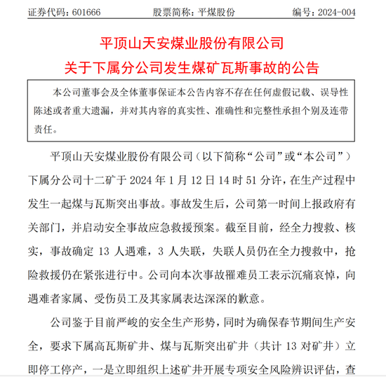 13人遇难,3人失联! 平煤股份:沉痛哀悼,13对矿井立即停工停产