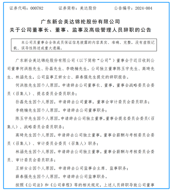 1月14日晚,美达股份(000782)公告,公司董事会于近日收到公司董事长何洪胜,公司董事孙磊、李晓楠,公司独立董事陈玉宇、高琦、林涵,公司监事王妍、薛泰强,副总经理、财务总监杨淑垒提交的辞职报告。