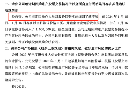 1月19日,*ST美盛回复称,经自查,公司前期因操作人员对股份回购实施细则了解不够,在2024年1月15日、1月16日存在以当日涨停价格申买、开盘集合竞价阶段申买情况,并在1月16日以涨停价格买入了100万股。