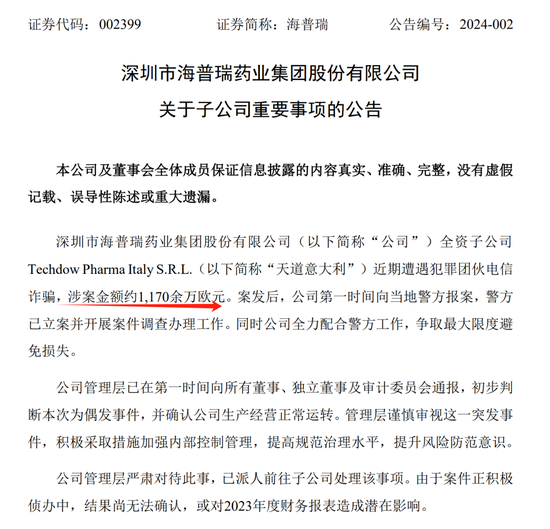 海普瑞1998年成立于深圳,是拥有A+H双融资平台的跨国制药企业。1月14日的公告显示,其全资子公司Techdow Pharma Italy S.R.L.(天道意大利)近期遭遇犯罪团伙电信诈骗,涉案金额约1170余万欧元。
