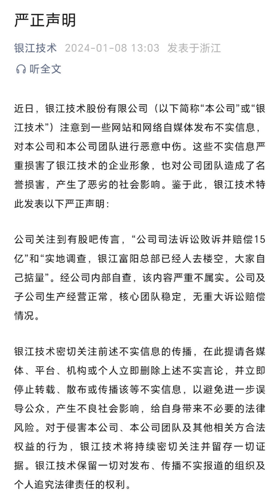 其提到,有股吧传言,“公司司法诉讼败诉并赔偿15亿”和“实地调查,银江富阳总部已经人去楼空,大家自己掂量”。经公司内部自查,该内容严重不属实。公司及子公司生产经营正常,核心团队稳定,无重大诉讼赔偿情况。