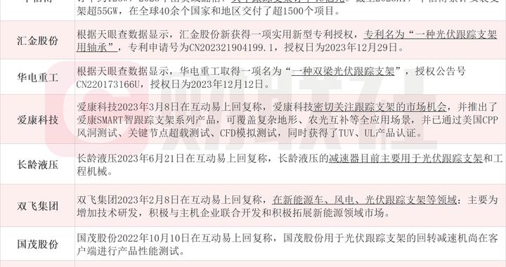 【清源股份12天8板 十余家上市公司布局光伏跟踪支架相关业务】财联社1月8日电,光伏支架产品主要有跟踪支架等的清源股份收盘斩获12天8板,最近12个交易日股价累计最大涨幅高达141.61%。据财联社不完全整理,包括清源股份、中信博、汇金股份、华电重工、爱康科技、长龄液压、双飞集团、国茂股份、江南奕帆、意华股份和天合光能在内累计11家上市公司业务涉及光伏跟踪支架。东北证券王小勇在2023年12月29日研报中指出,中信博为跟踪支架国内龙头,截至2023Q3跟踪支架订单46亿元。小财注:王小勇指出,光伏跟踪支架较固定支架有5%~35%的发电增益,其中电控系统为技术核心,尤其适用于直射比较高中纬度地区。