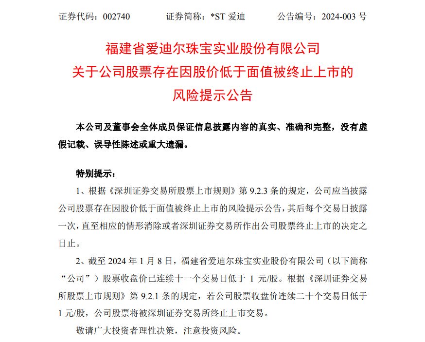中新经纬1月8日电 *ST爱迪1月8日盘后公告称,因股价连续十一个交易日低于1元/股,存在被终止上市风险。
